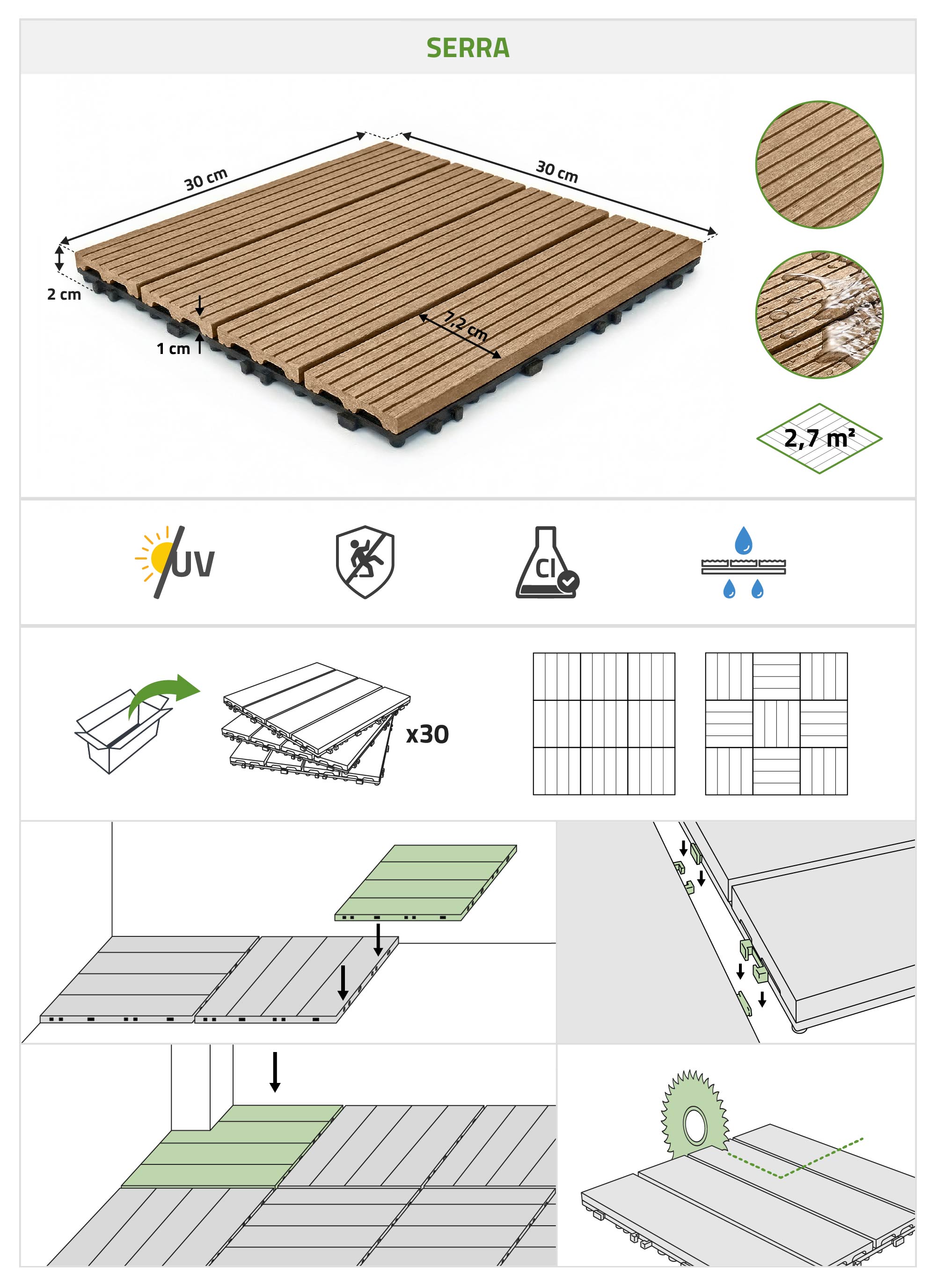 Set of 30 interlocking SERRA teak-grooved composite terrace tiles, 30x30cm